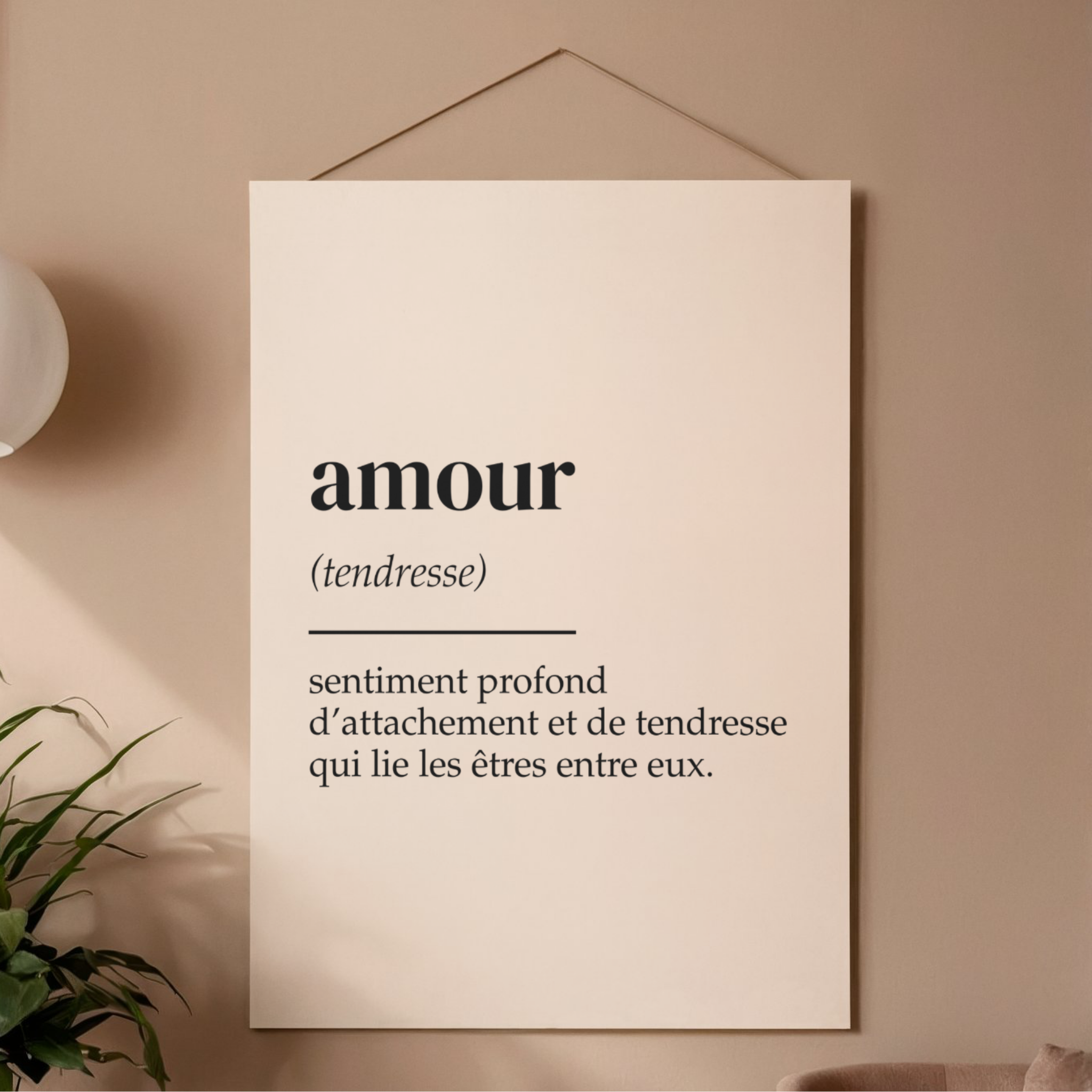 Cette affiche typographique française met en lumière la définition du mot « Amour » avec élégance et sensibilité. Le design minimaliste présente le mot en caractères serif imposants, suivi de sa prononciation « (tendresse) » et d’une définition touchante : « sentiment profond d’attachement et de tendresse qui lie les êtres entre eux ».