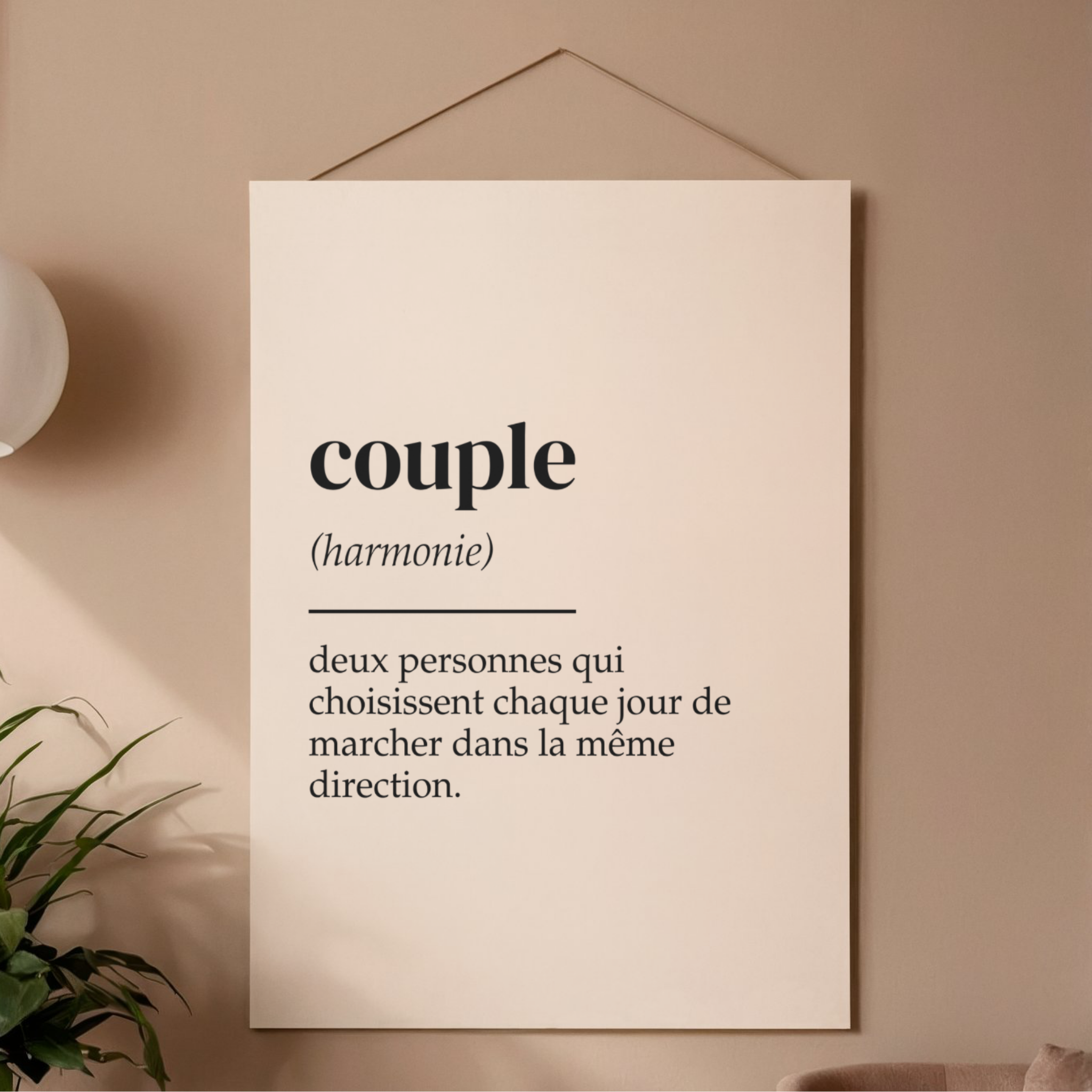 Cette affiche typographique française rend hommage au mot « Couple » avec une définition poétique et profonde : « deux personnes qui choisissent chaque jour de marcher dans la même direction ». Un message qui capture parfaitement l’essence d’une relation amoureuse durable, basée sur le choix conscient, l’engagement mutuel et la complicité.