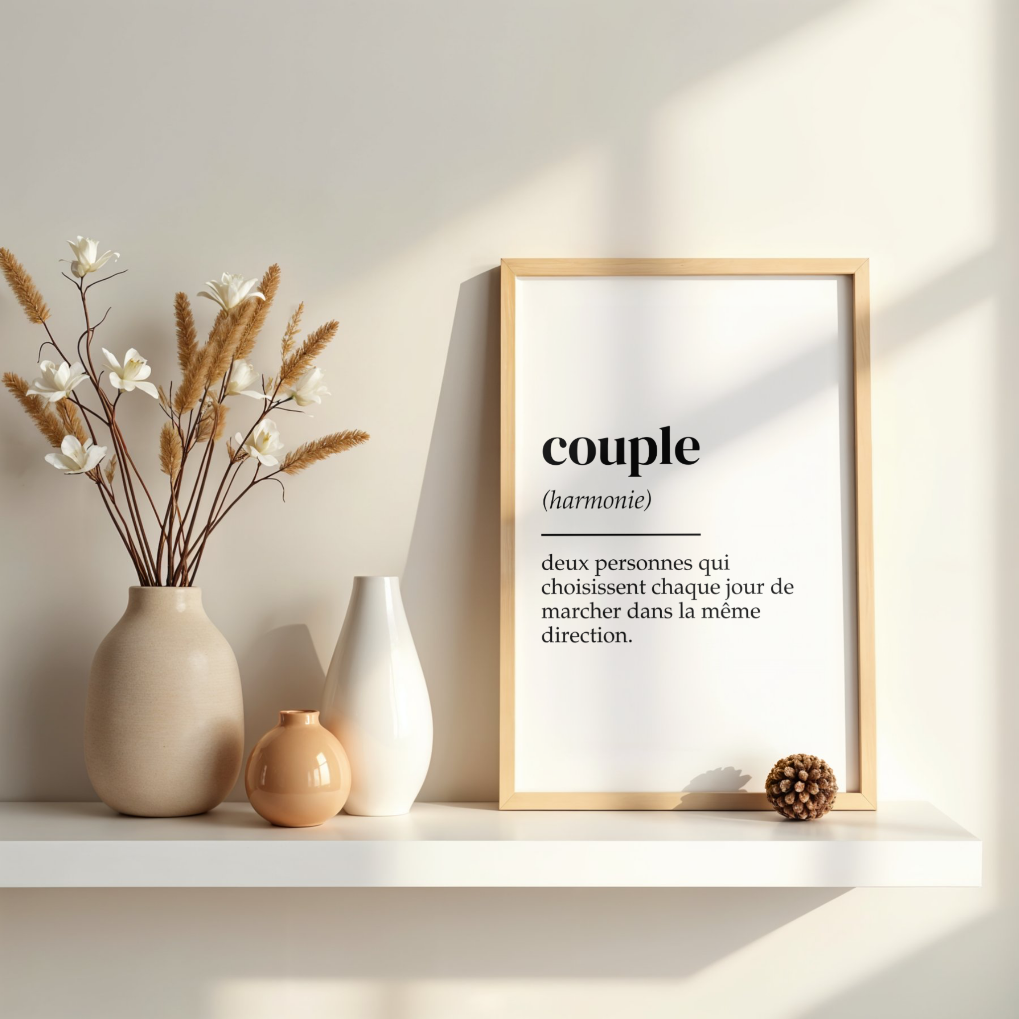 Le design minimaliste façon dictionnaire présente le mot en caractères serif imposants, suivi de sa prononciation « (harmonie) » et d’une définition qui reflète la beauté d’un amour qui se construit jour après jour. Le contraste noir sur blanc crée une élégance intemporelle parfaite pour une chambre romantique. Cette affiche rappelle que l’amour n’est pas qu’un sentiment, c’est un choix quotidien de rester ensemble, de se soutenir et d’avancer côte à côte.