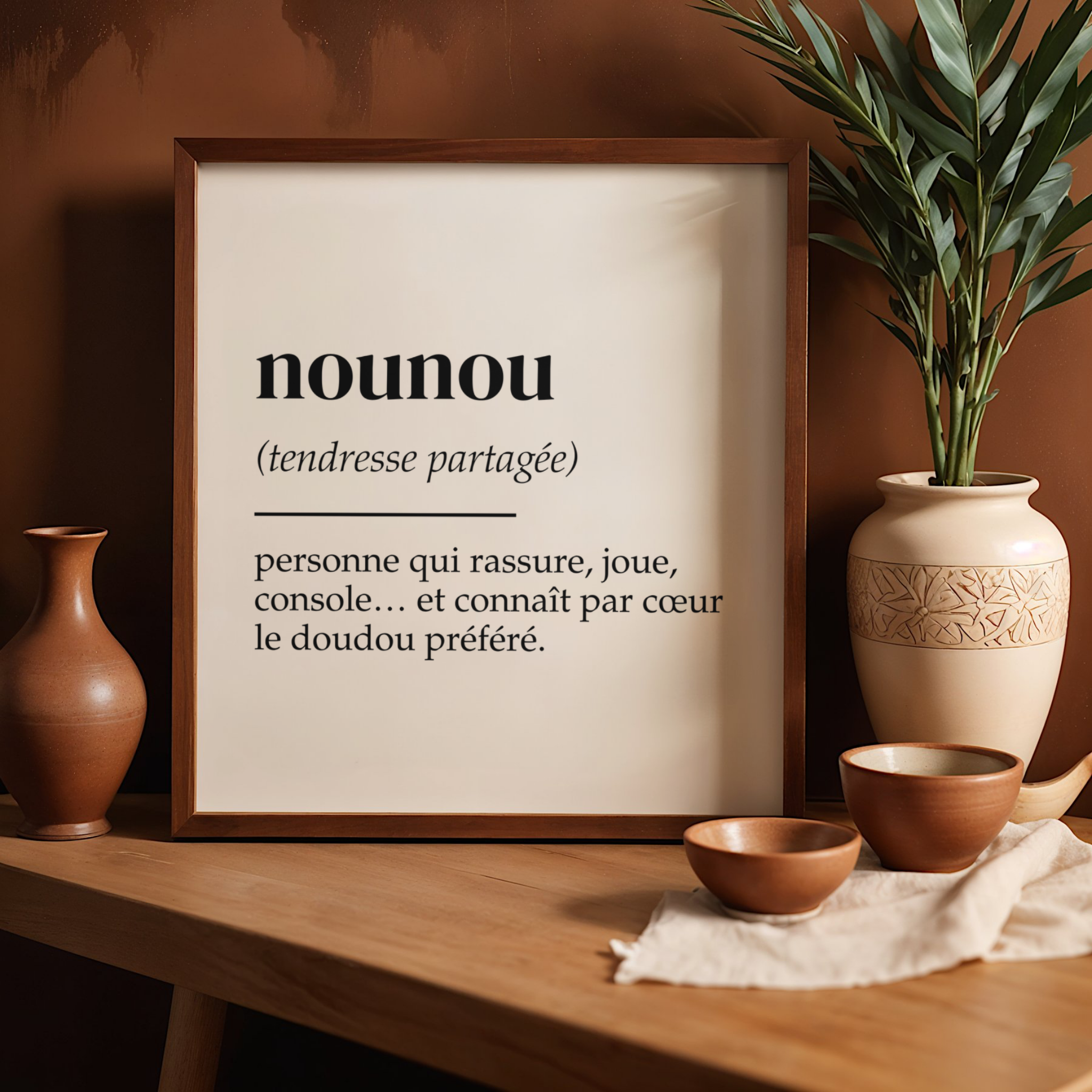 L’affiche définition Nounou célèbre celle qui rassure, console, joue et connaît par cœur le doudou préféré. Chaque mot a été choisi pour évoquer la douceur du lien qui unit la nounou à l’enfant. C’est une décoration murale qui touche le cœur, tout en restant intemporelle et raffinée. Parfaite pour offrir en fin d’année, à Noël ou lors d’un départ, cette affiche devient un souvenir incontournable.