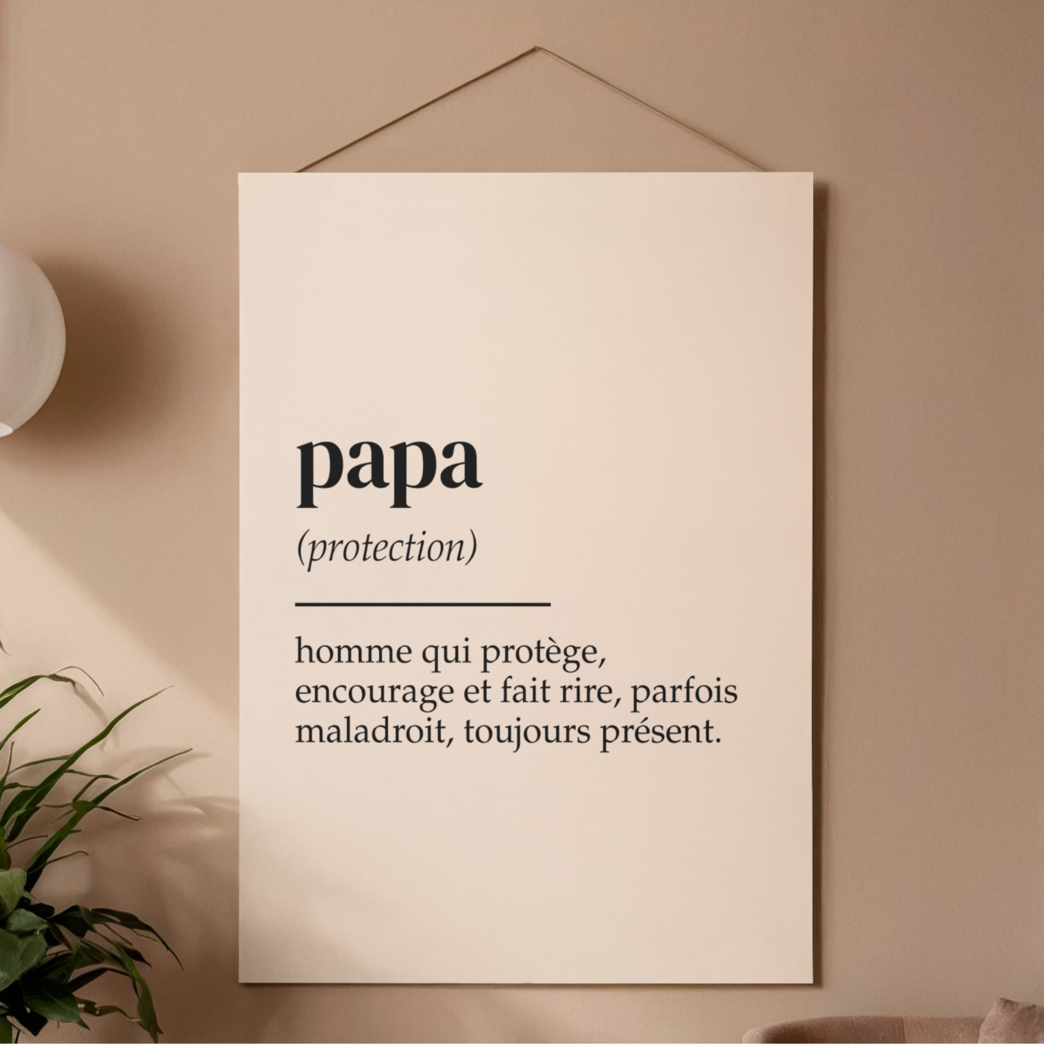 Cette affiche définition papa est une véritable déclaration d’amour quotidienne, un rappel visuel de cet homme irremplaçable qui répare tout (même ce qu’il ne sait pas réparer), raconte les meilleures histoires et reste votre héros, quel que soit votre âge.