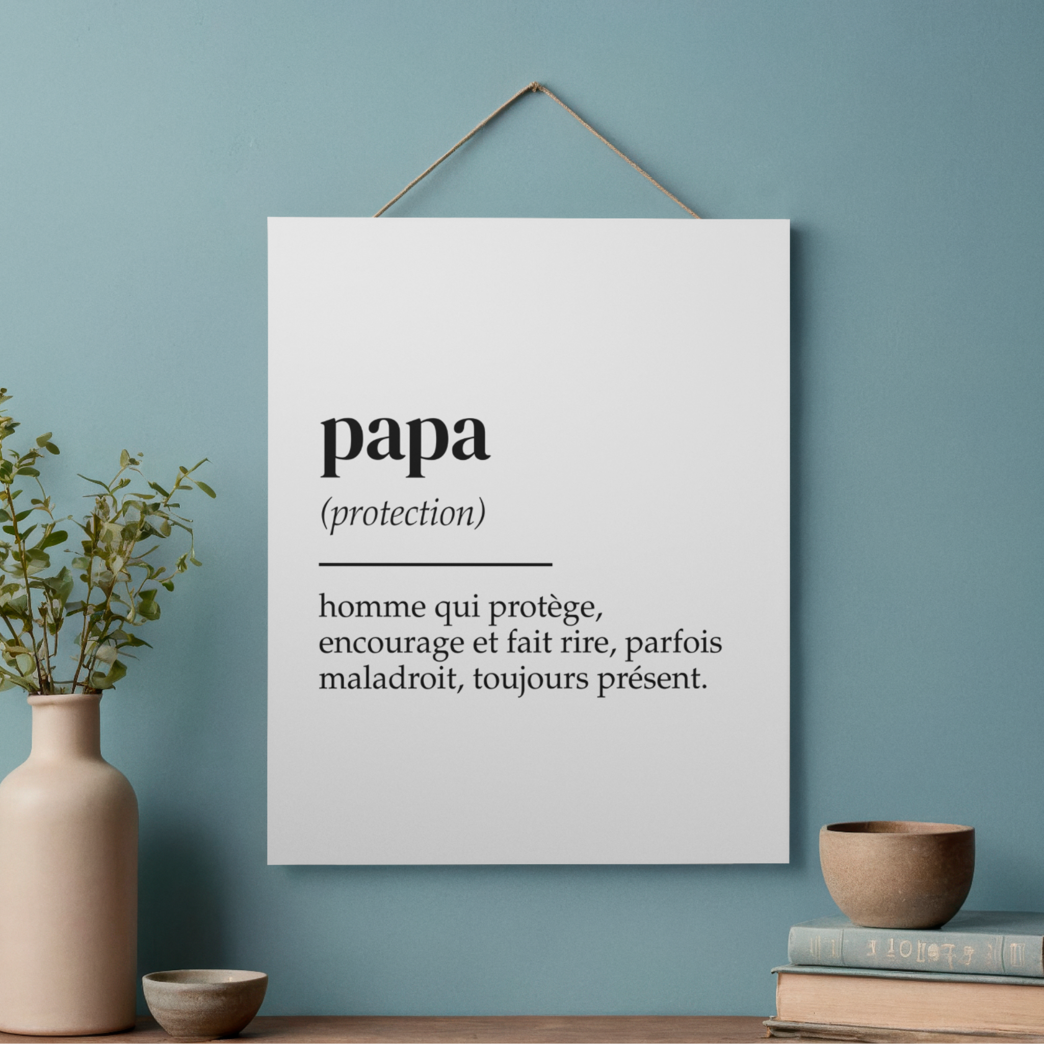 Le design minimaliste façon dictionnaire présente le mot en caractères serif imposants, suivi de sa prononciation « (protection) » et d’une définition qui reflète la force rassurante, l’humour décalé et la présence inconditionnelle d’un papa. Le contraste noir sur blanc crée un impact visuel élégant et intemporel qui s’intègre parfaitement dans tous les styles d’intérieur.