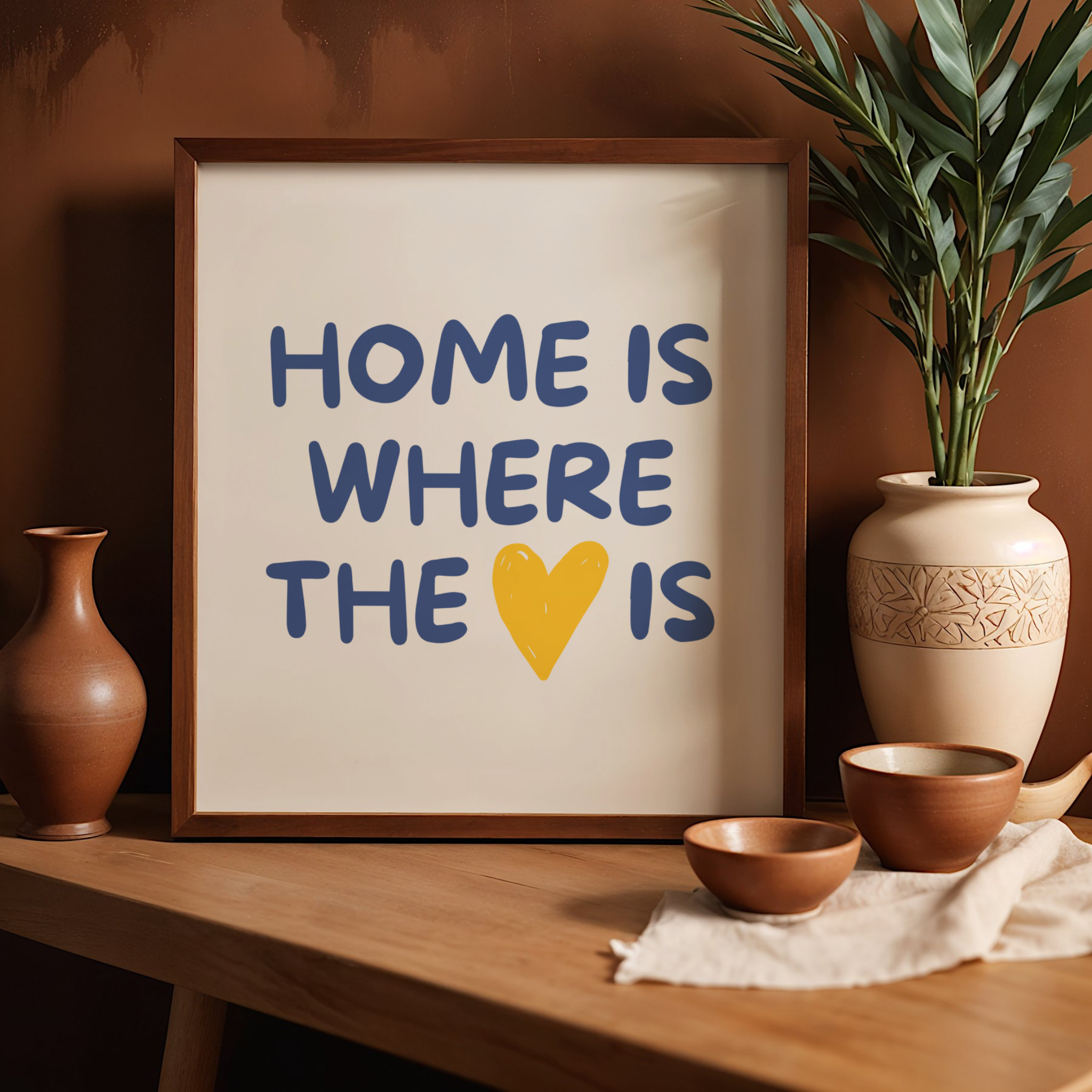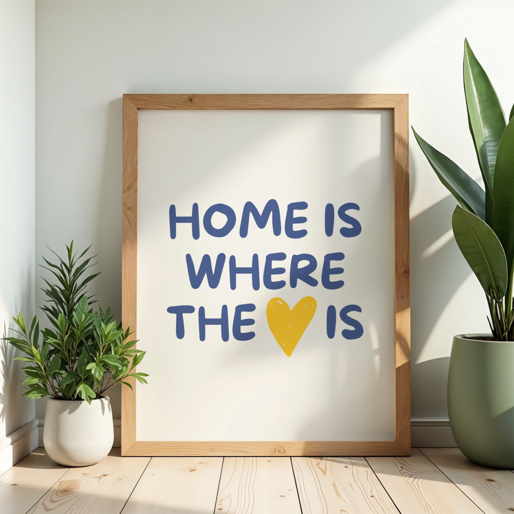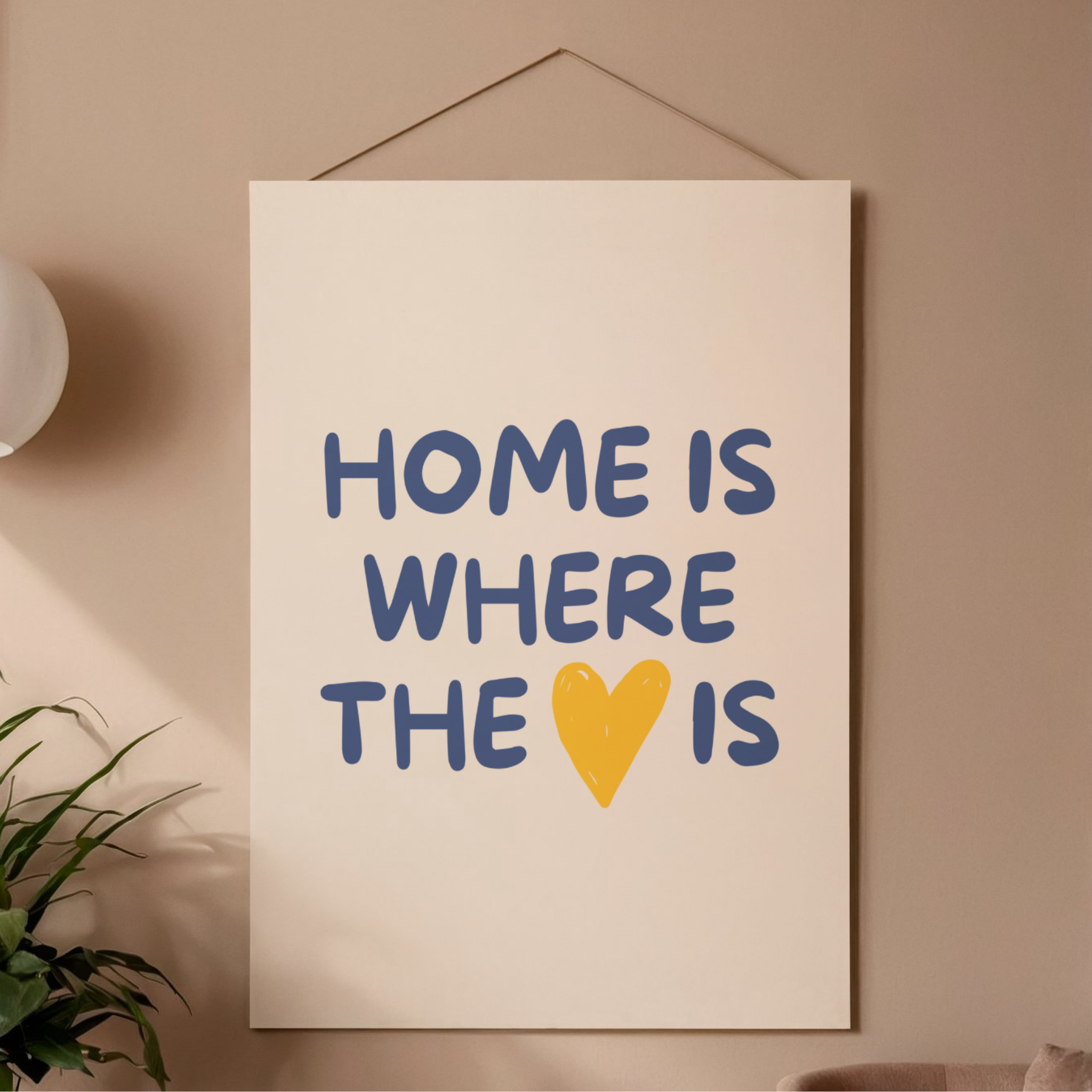 Cette affiche typographique illustre la citation anglaise emblématique « Home is where the heart is » (La maison est là où est le cœur) avec un design chaleureux et contemporain. Les lettres manuscrites en bleu marine évoquent la douceur et le confort, tandis que le cœur jaune moutarde apporte une touche de gaieté et d’optimisme.